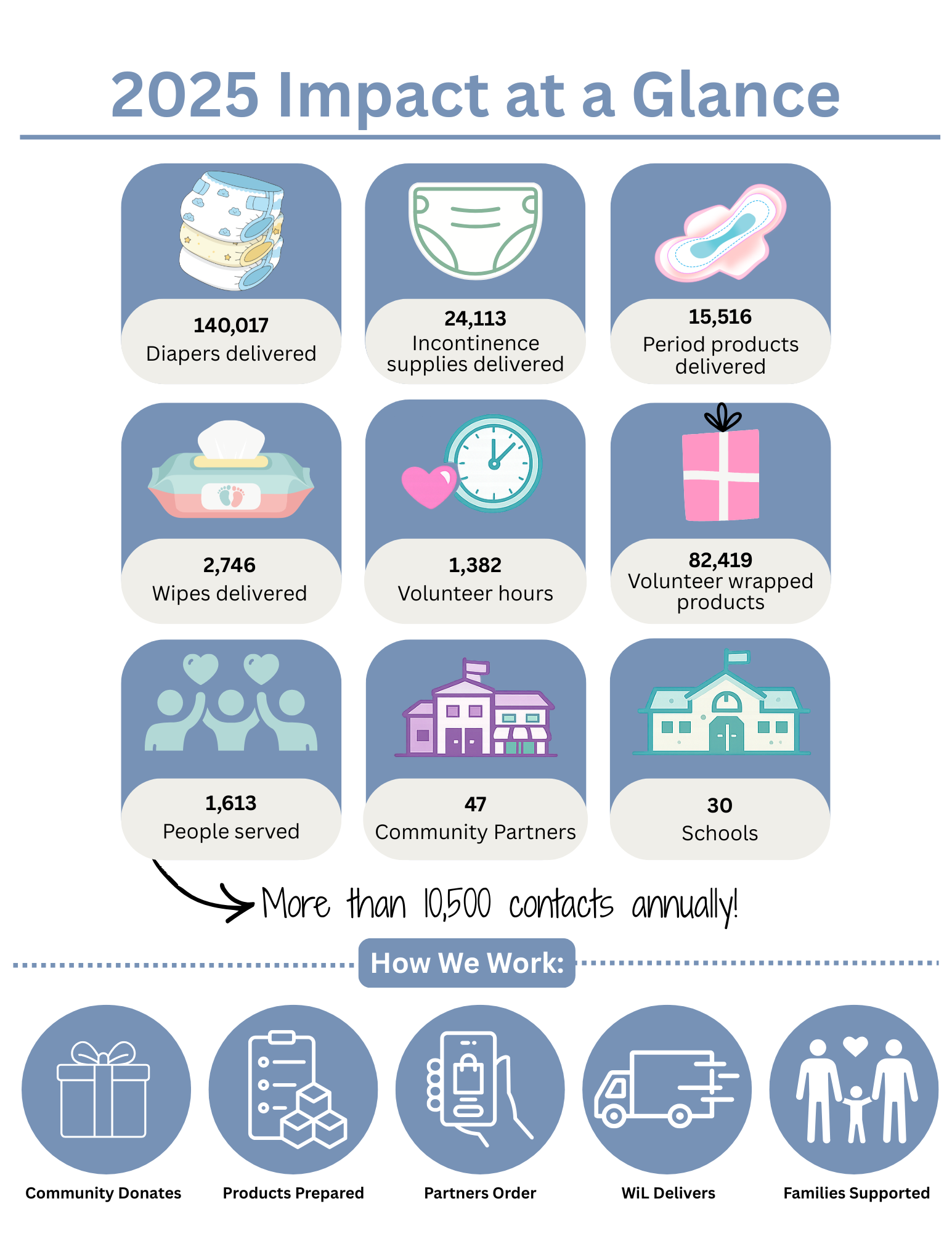 • In 2025, more than 182,000 diapers, wipes, period products and incontinence items were delivered to 429 children, 84 adults, and 1,100 girls and young women. We worked with 47 community partners and 30 schools to distribute items through their programs.